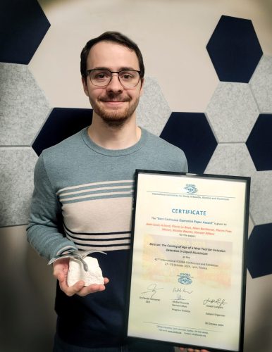 L’un des co-auteurs de l’article scientifique, Vincent Milani, expert technique chez STAS, avec le trophée et le certificat officiel lors de leur passage au Saguenay avant d’être envoyé à leur destination finale en France chez Constellium. Ce prix symbolise la reconnaissance internationale de l’innovation et de l’impact de la technologie BATSCAN® dans l’industrie.