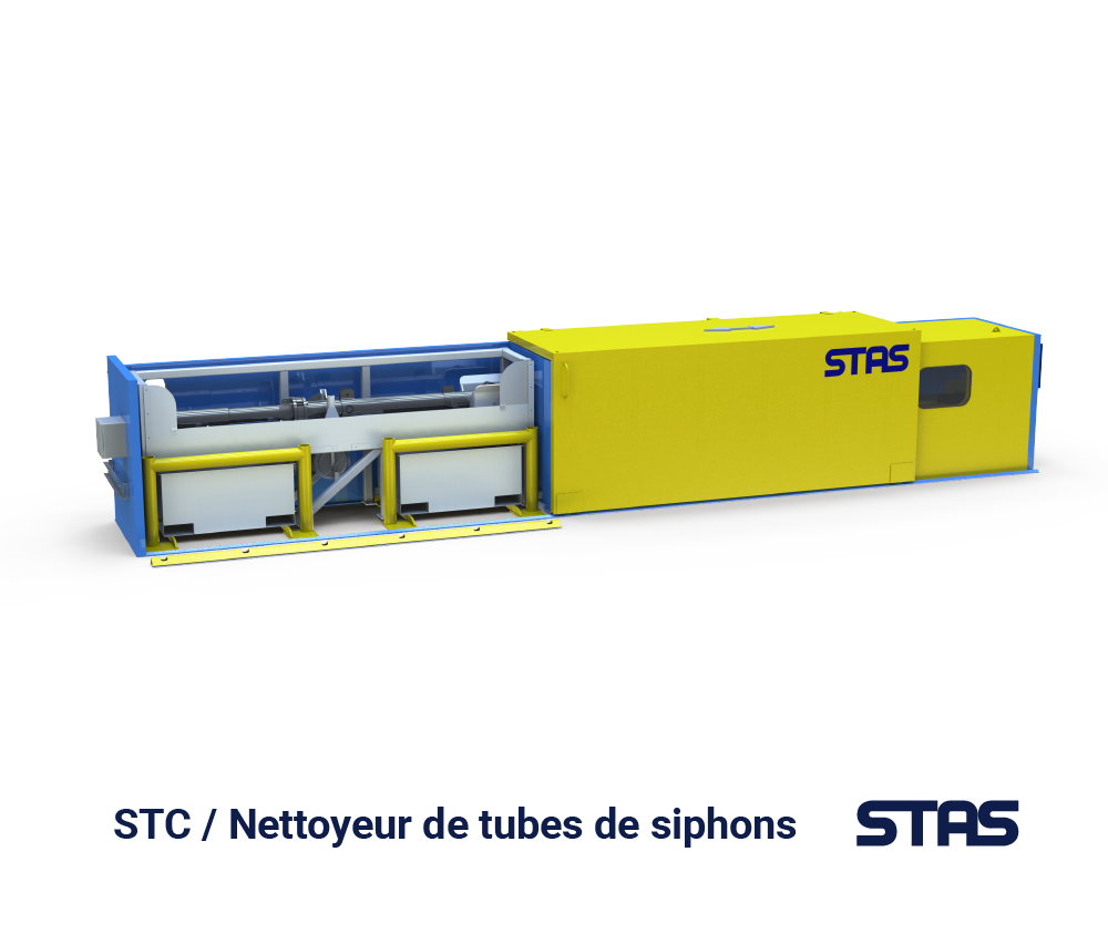 Le STC se compose d’un boîtier ventilé et insonorisé, de supports de tube et d’un module de nettoyage avec fonctions de rotation et de translation.